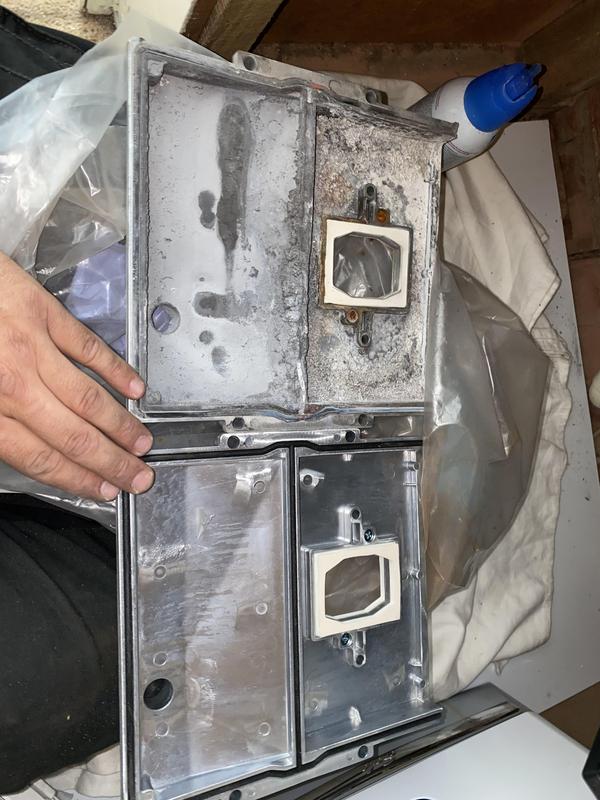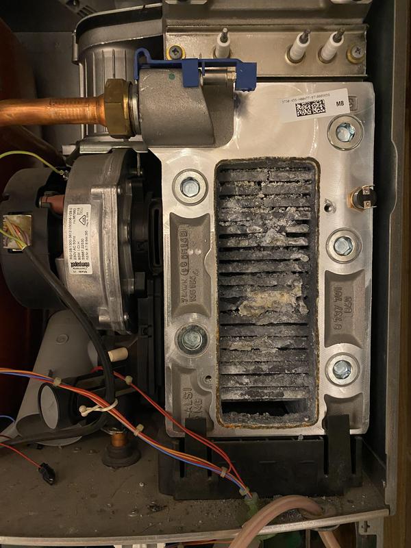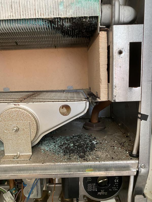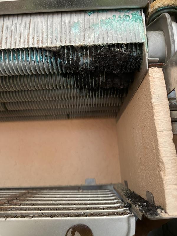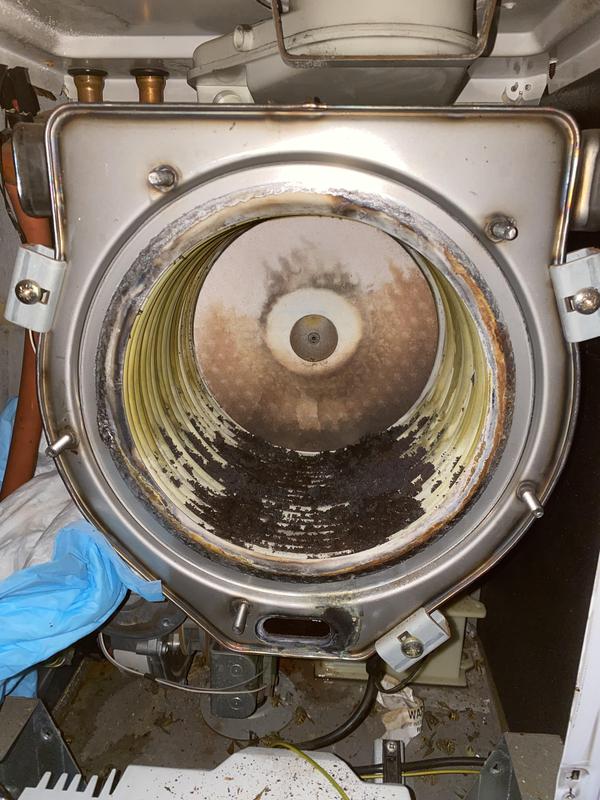 - Worcester Boiler full strip down service photo 1. dirty blocked heat exchanger leading to inefficiency and poor operation.