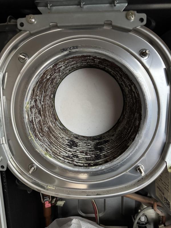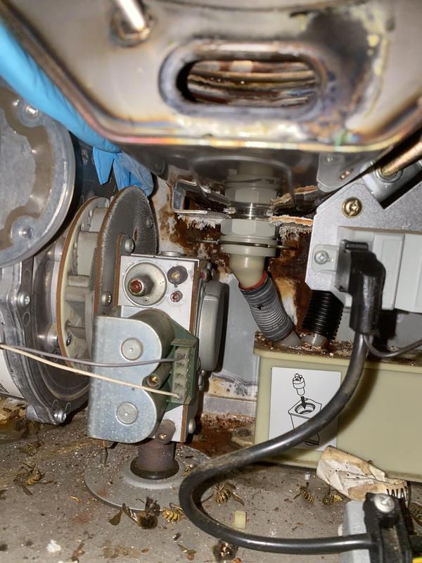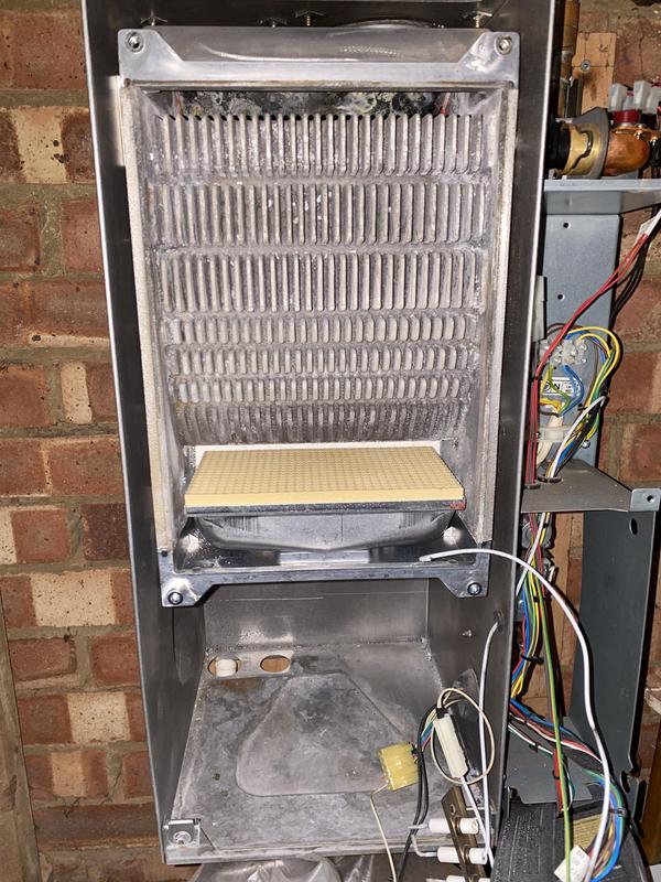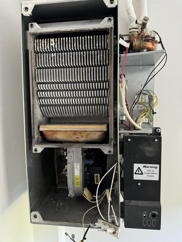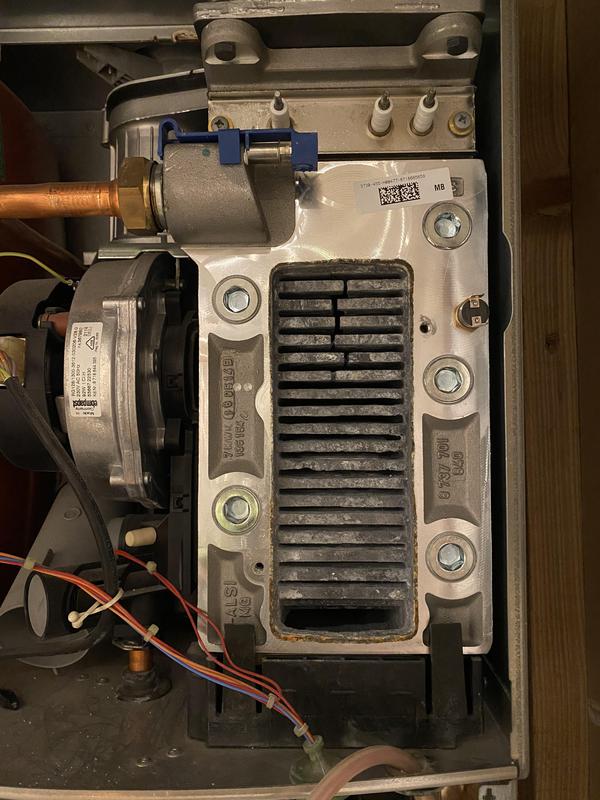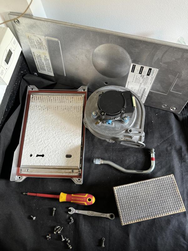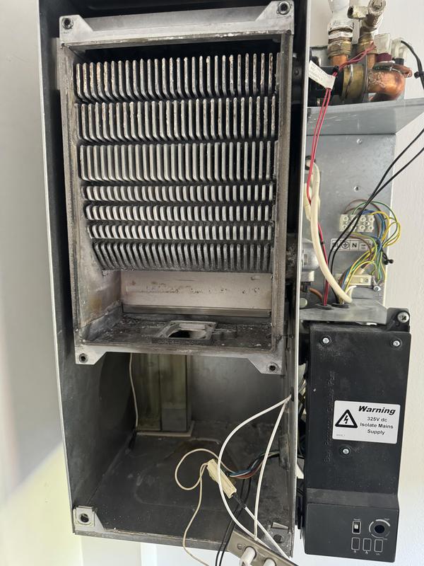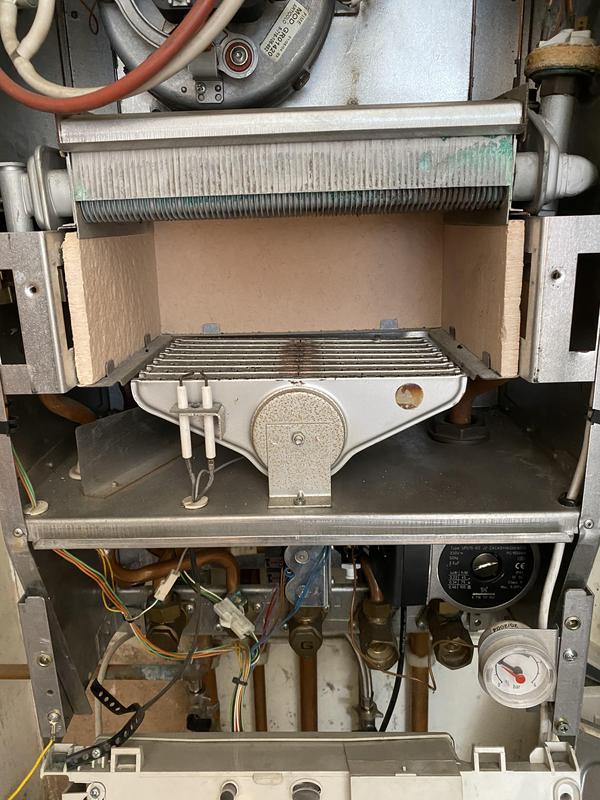 - Worcester Boiler full strip down service photo 2. After a major clean of the Heat Exchanger pathways are now clear and boiler operation and efficiency greatly improved.