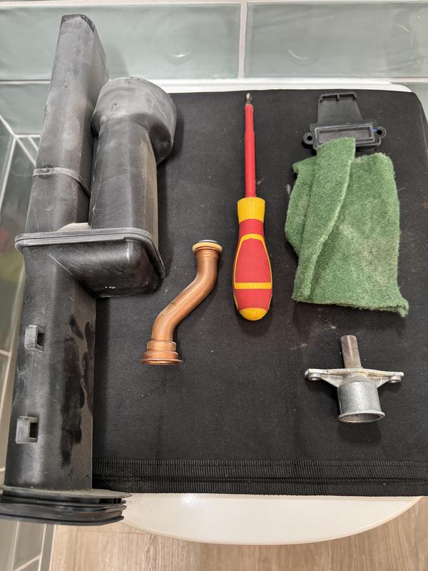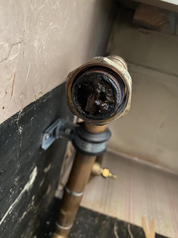 - Found on a system that required powerflushing, Towel Rail hadn't work for years and this blockage was the reason both the valves and pipework were solid with sludge