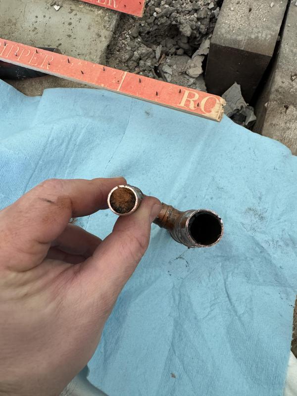 - Pip blocked solid with sludge causing major issues to the boiler and heating system. Located and removed during a powerflush.