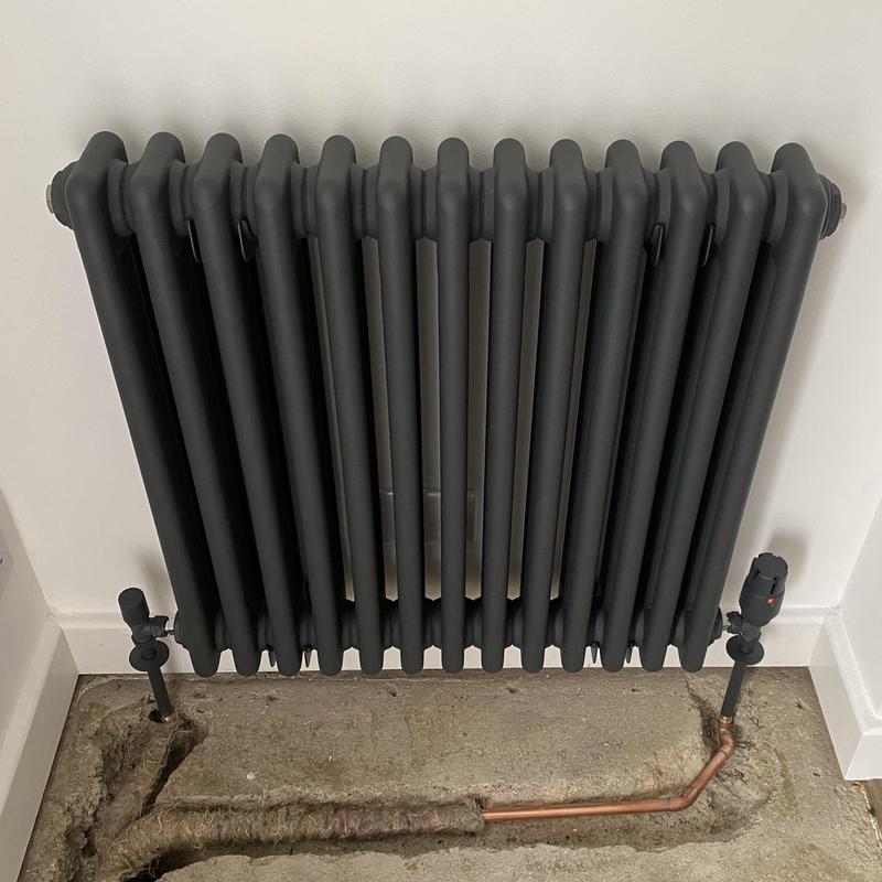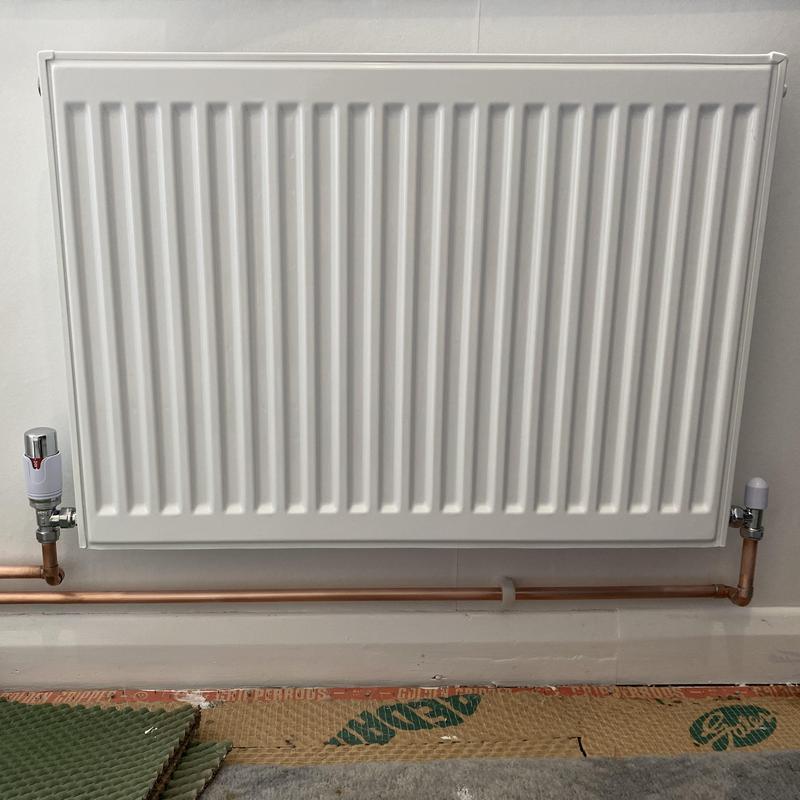- Replacement Radiator moved to a new wall from previous, pipework chased into the solid floor and protected before making good.