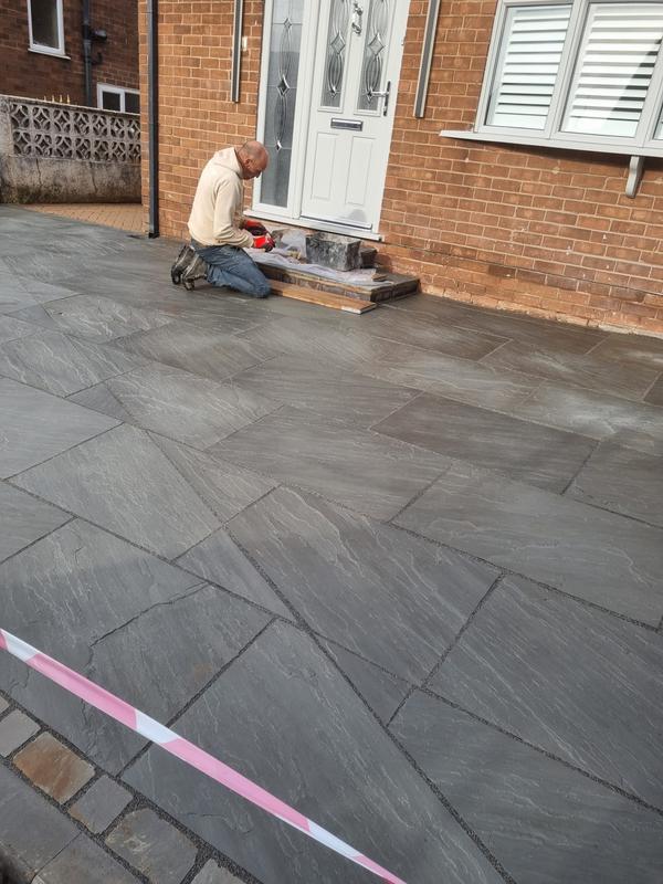 - Kandla grey Indian stone driveway lay on concrete jointed with a strong grey resin