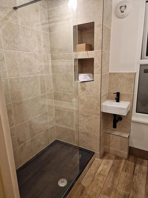 - Spacious shower tray and full bathroom installation by Prime Builders