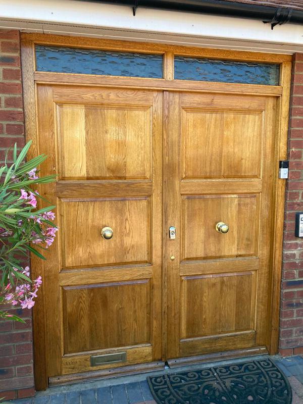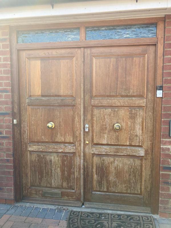 - BEFORE: Large twin front doors before restoration.