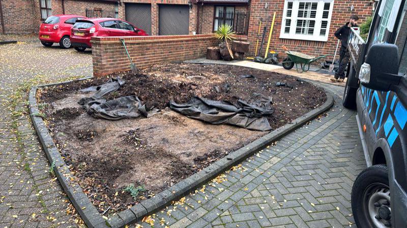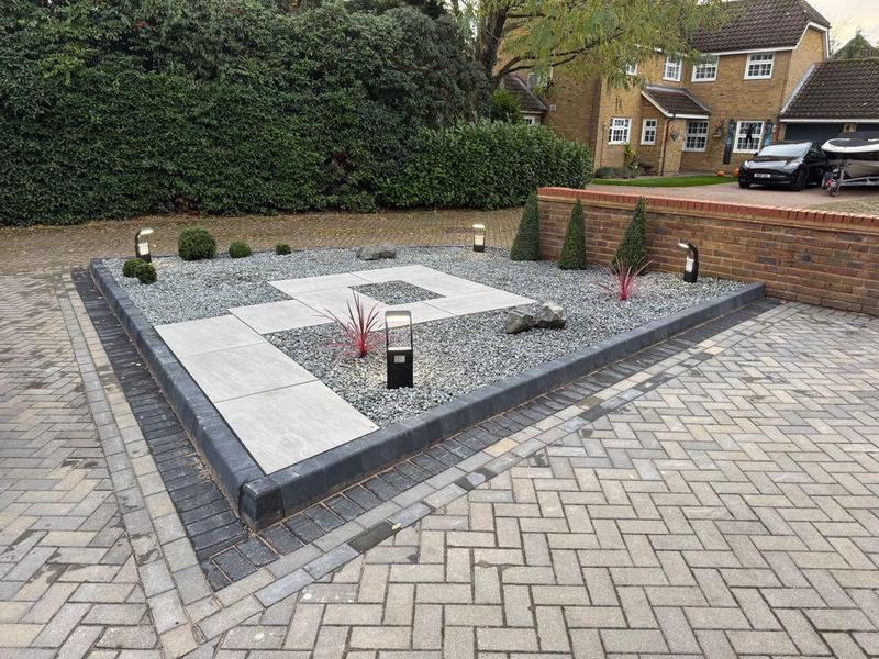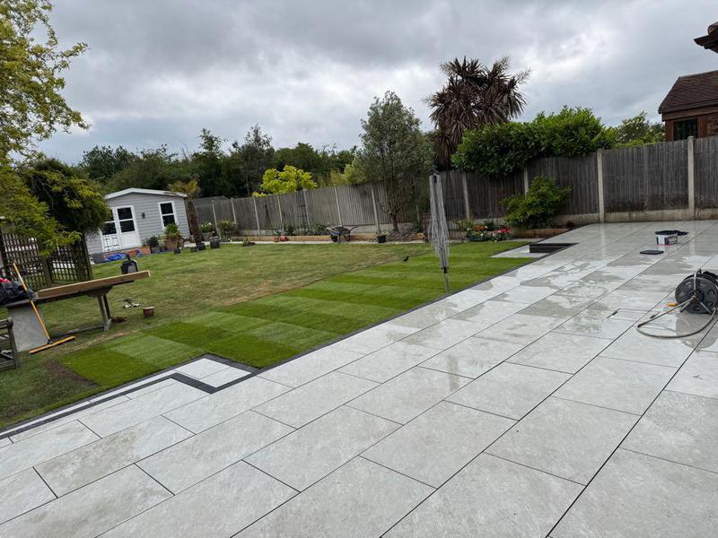 - New garden refurb, consisting of raised sleeper flower bed, kandla grey Indian sandstone patio and newly laid turf