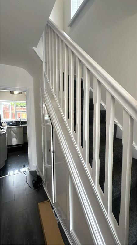 "Painted upstairs landing, doors, frames, skirting and stairwell ceiling. Carefully masked off carpeted areas and banisters, included chrome hinges and door handles too. A beautiful job, carried out with a lot of precision and no faults. Carpet edge was free of paint too. It is refreshing to find a trader who takes so much care. I will use no other."