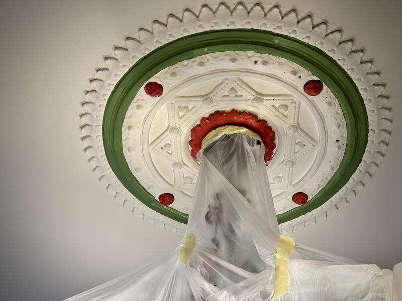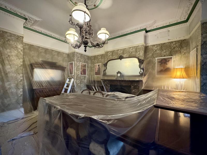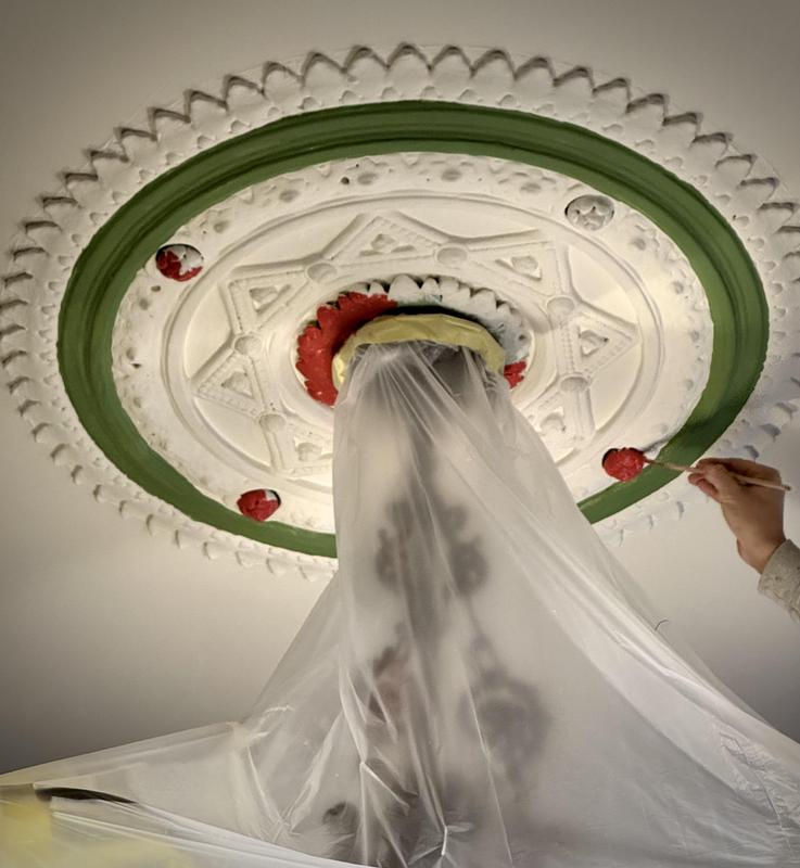 - Retain existing Morris & Co Wallpaper, repair lining areas to ceiling and redecorate ceiling, cornice & all woodwork.