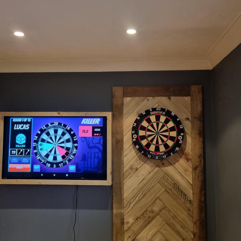 - Augmented dartboard setup , made with reclaimed wood for back panel and tv surround