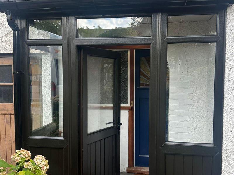 - Finished Pic of New Porch in South London. Black Double Glazed Upvc Frames & New Timber Constructed Lean to Roof with Composite Tiles