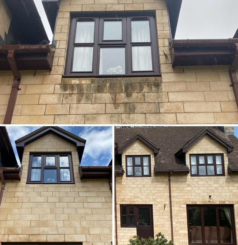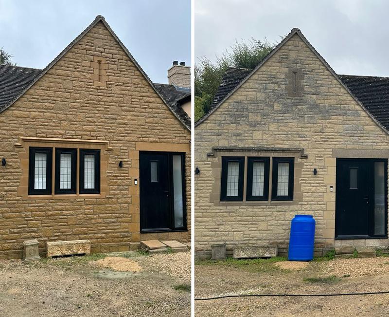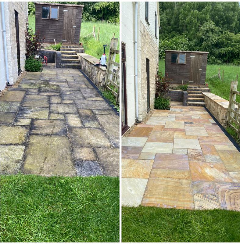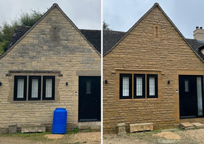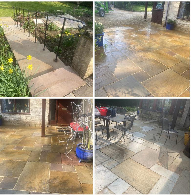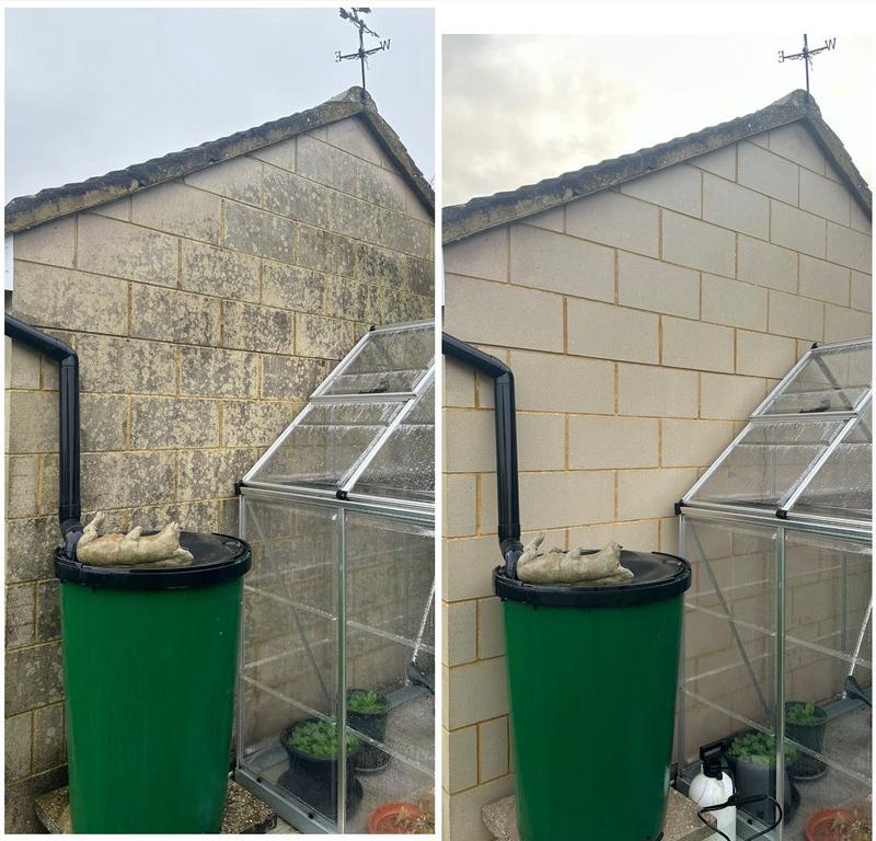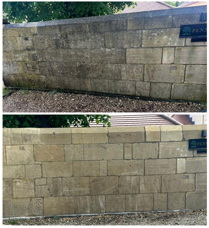 "Really pleased with the work, soft washed Cotswold Stonewall which looks amazing, and cleaned our huge patio and re-sanded and brought back to its best. Thank you Steve, Gavin and Sam 👍🏻"
