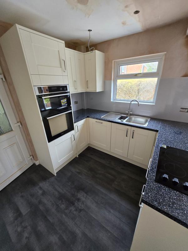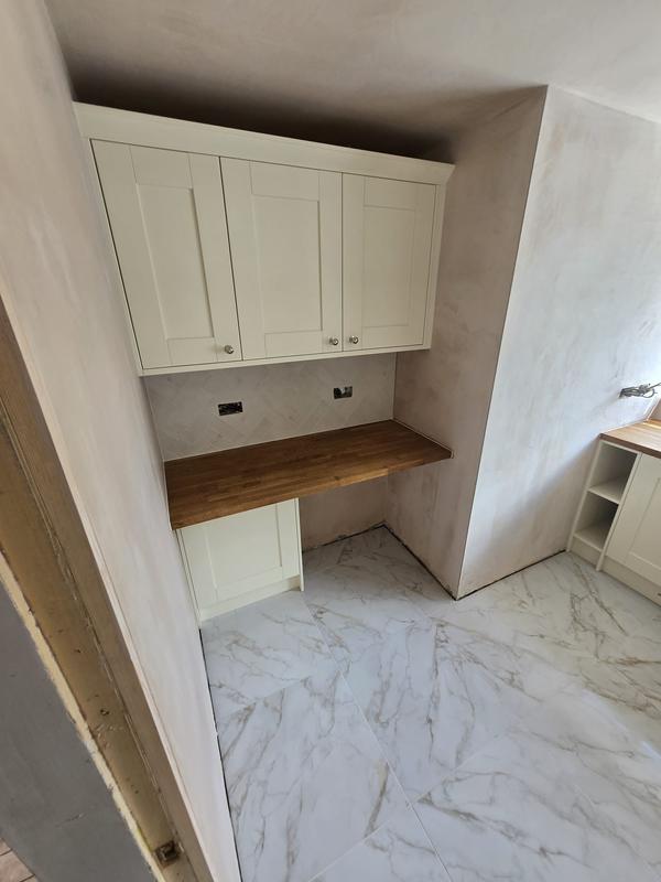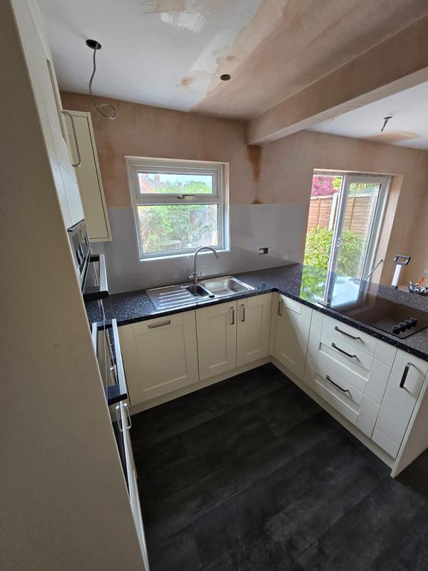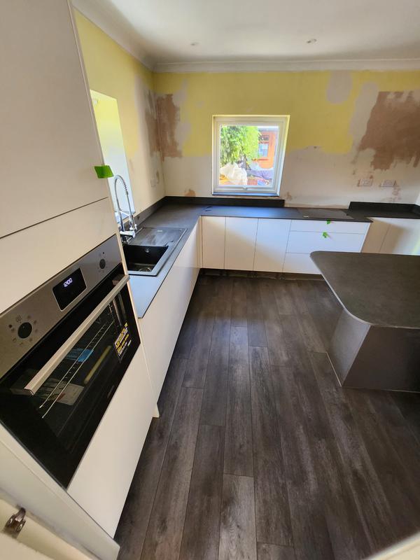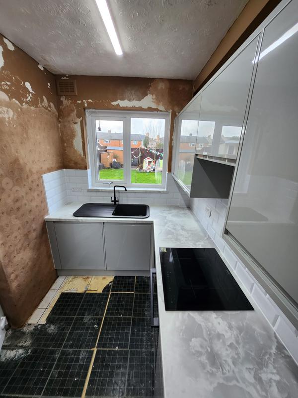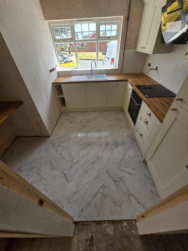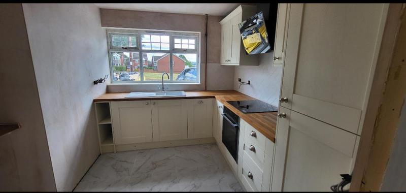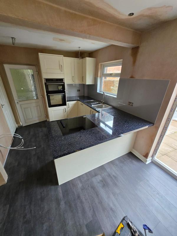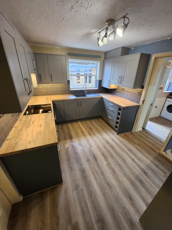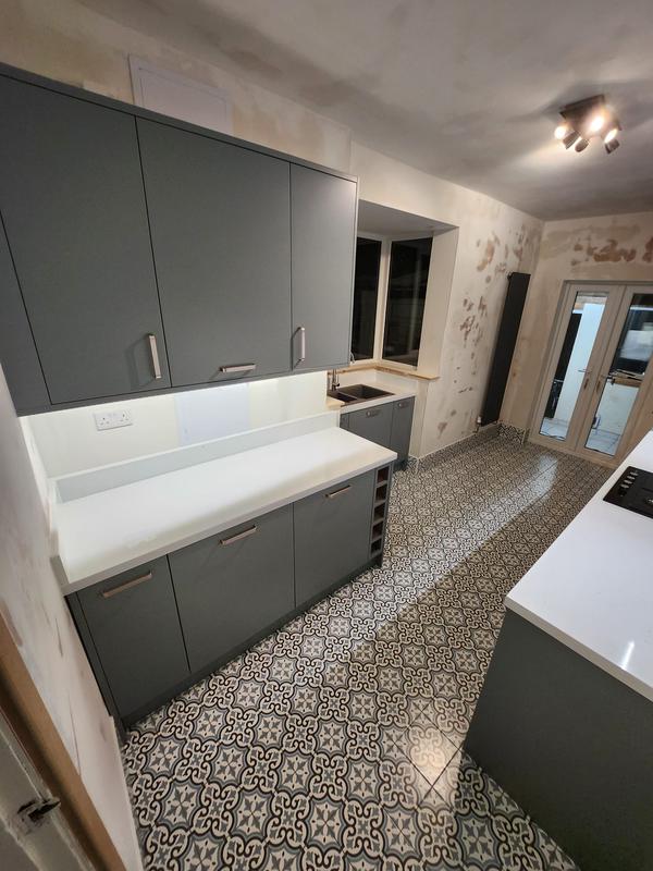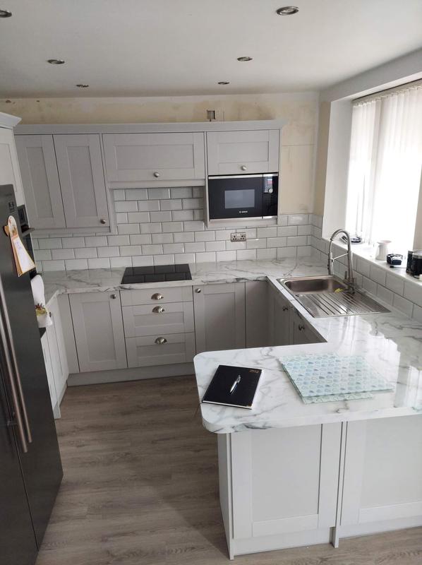 Nicola - Image 1 "Really pleased. Was punctual, kept me well informed. Did a great job overall. My only negative was the floor tiles were slightly out but I think that was more down the kitchen not being level rather than the tiling itself. I had the floor tiles down first then the kitchen cupboards placed on top and it wasn't until the cupboards went in that you could see it but the tiling itself was very neat. I had the heringbone tiles on the wall and they did a fantastic job with those. Very pleased with everything else. They did a great job"