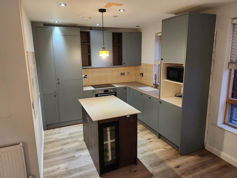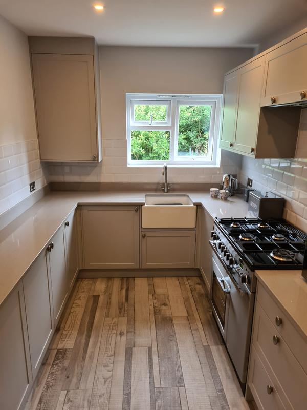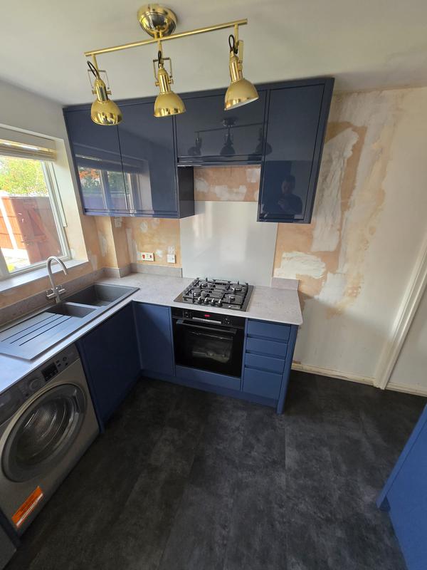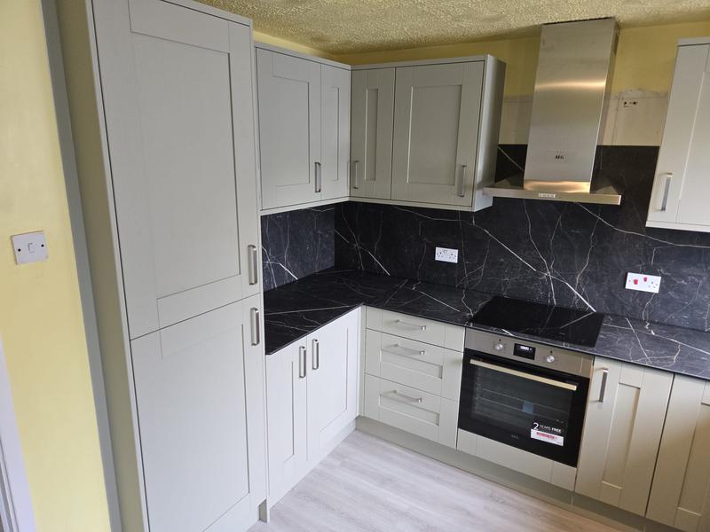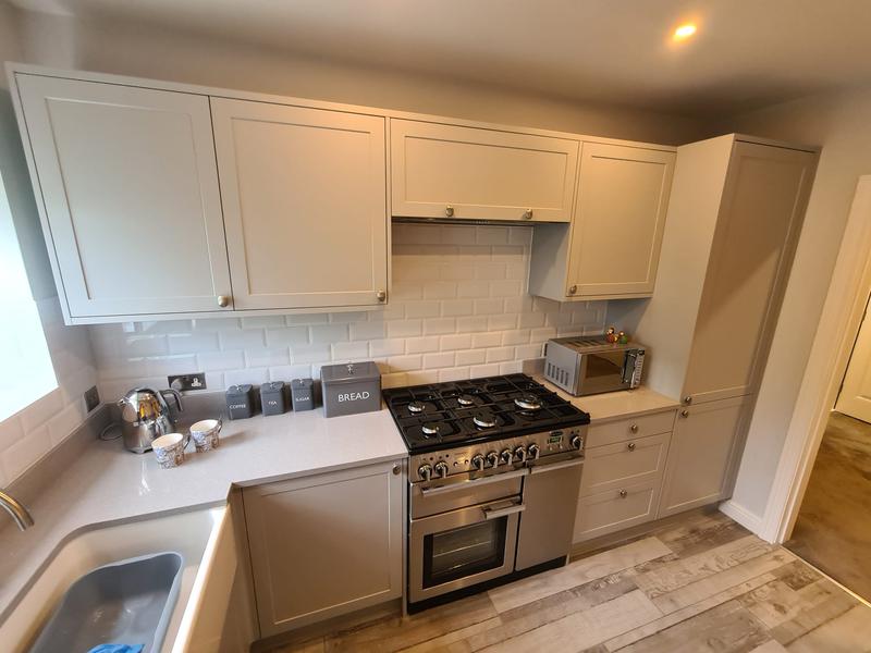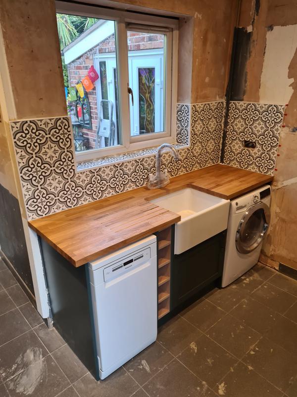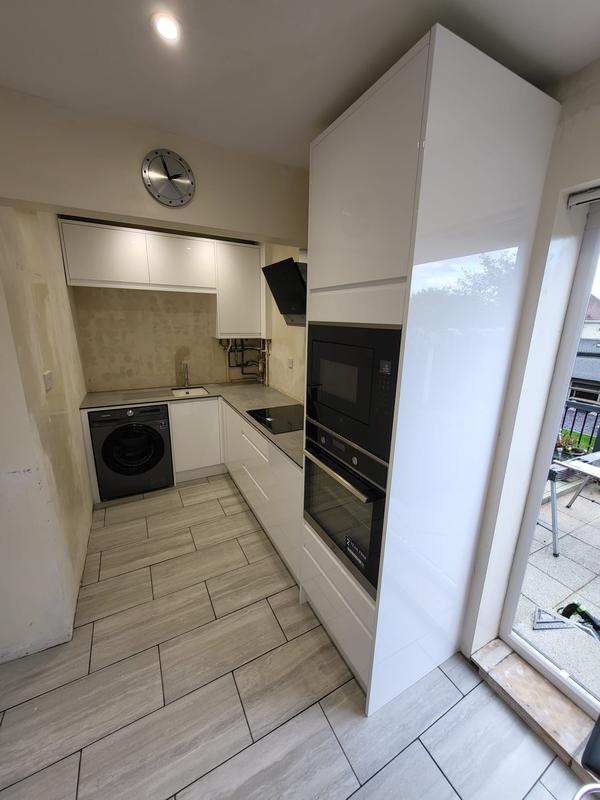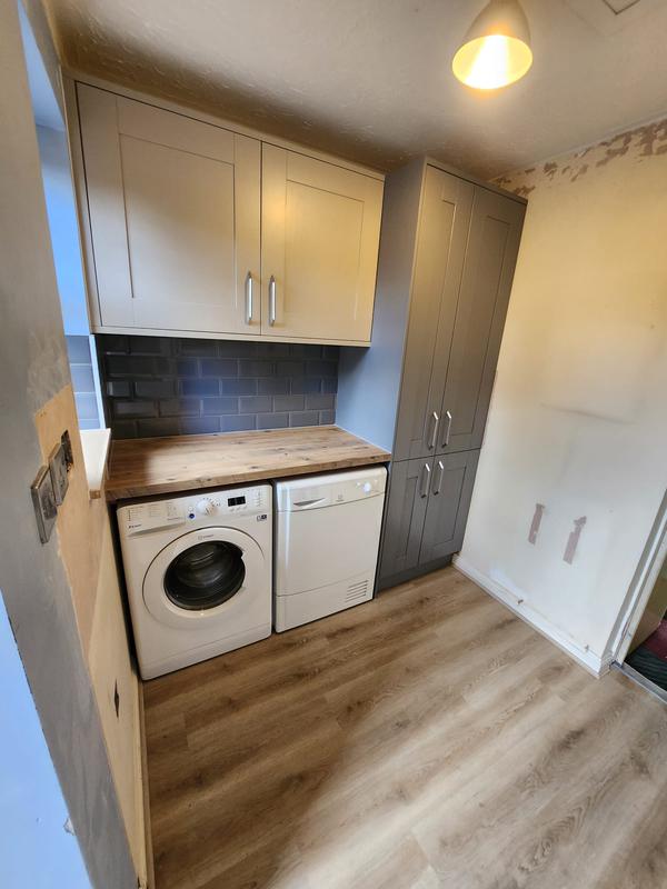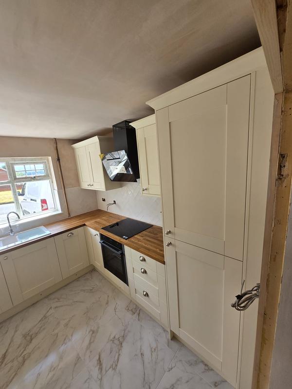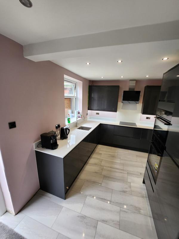 Nicola - Image 1 "Really pleased. Was punctual, kept me well informed. Did a great job overall. My only negative was the floor tiles were slightly out but I think that was more down the kitchen not being level rather than the tiling itself. I had the floor tiles down first then the kitchen cupboards placed on top and it wasn't until the cupboards went in that you could see it but the tiling itself was very neat. I had the heringbone tiles on the wall and they did a fantastic job with those. Very pleased with everything else. They did a great job"