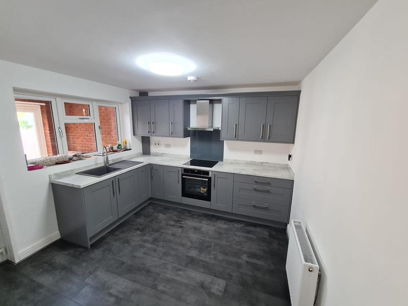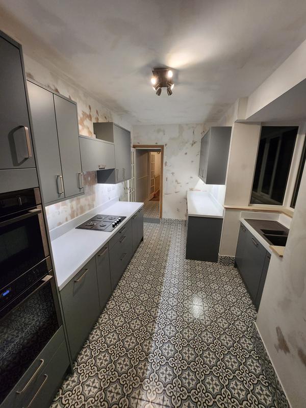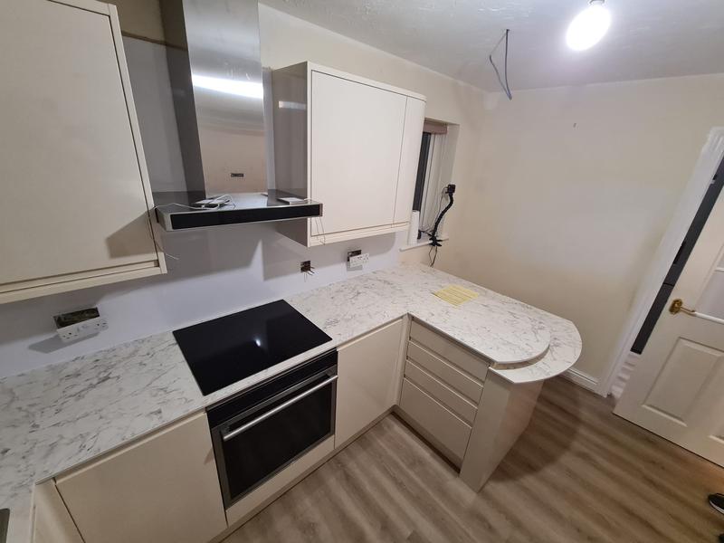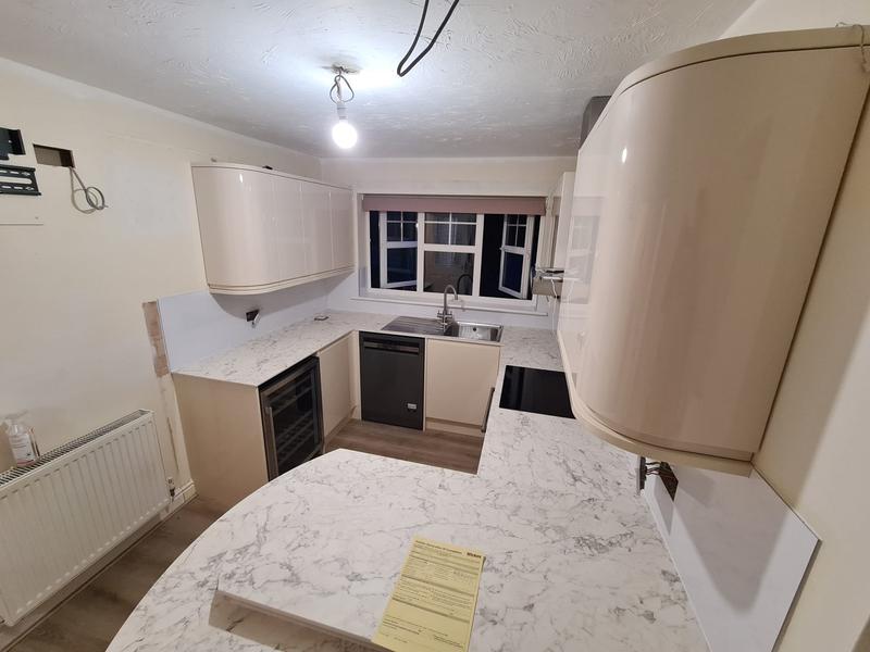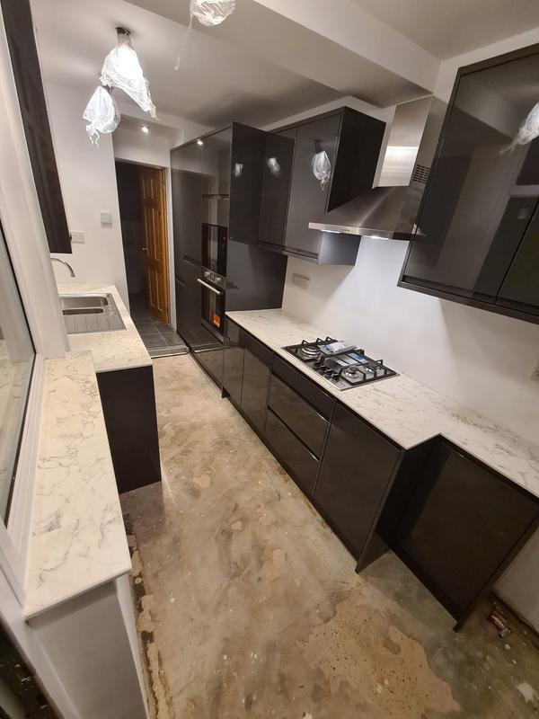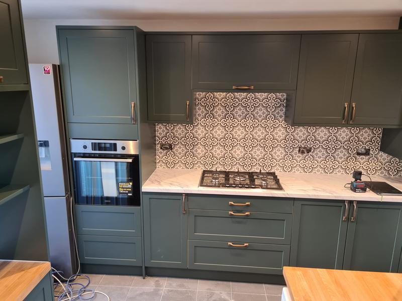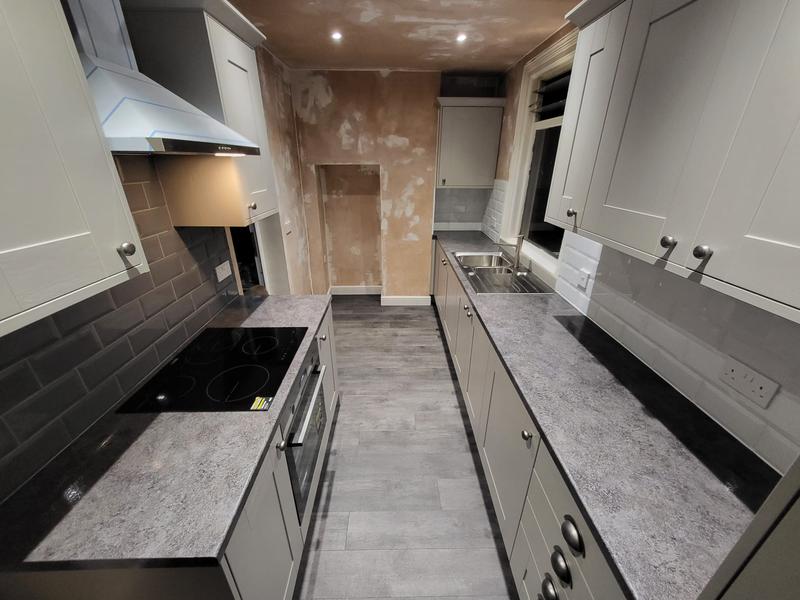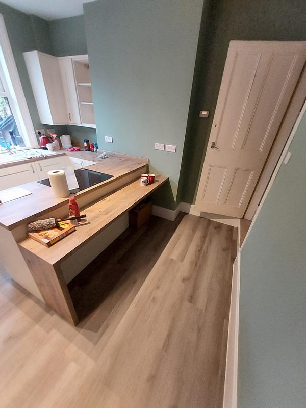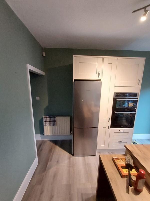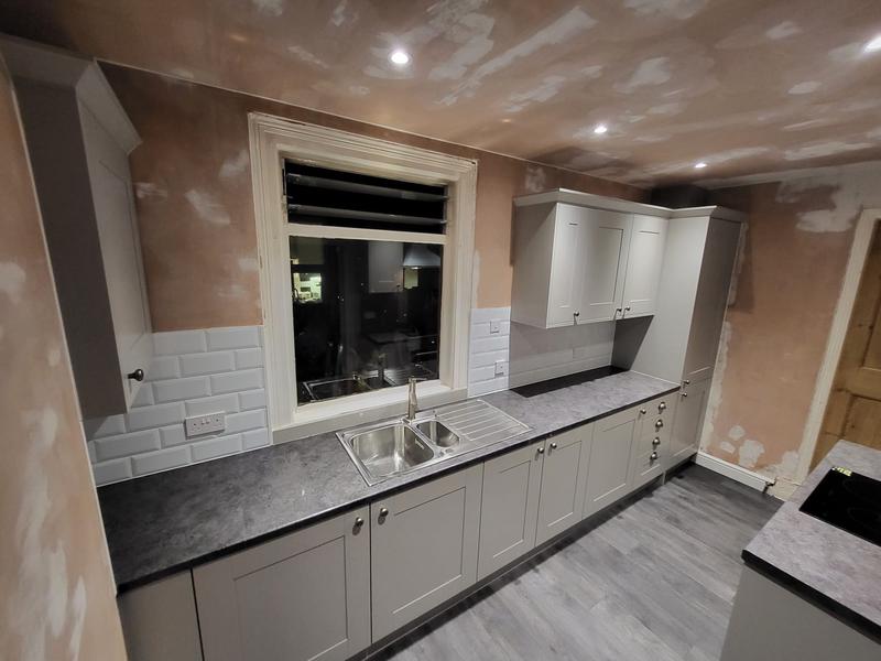 Nicola - Image 1 "Really pleased. Was punctual, kept me well informed. Did a great job overall. My only negative was the floor tiles were slightly out but I think that was more down the kitchen not being level rather than the tiling itself. I had the floor tiles down first then the kitchen cupboards placed on top and it wasn't until the cupboards went in that you could see it but the tiling itself was very neat. I had the heringbone tiles on the wall and they did a fantastic job with those. Very pleased with everything else. They did a great job"