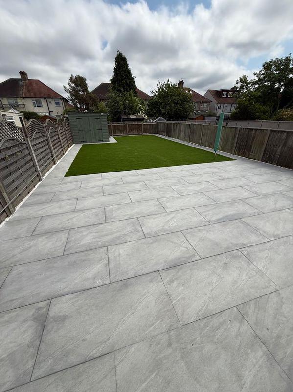 - Very bright but this porcelain patio looks stunning against the retaining sleepers, new turf and play bark area