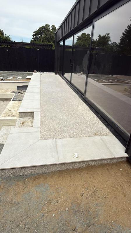 - this huge project was so fun, pergola with a recessed fire pit with active drainage system. over 80m2 of porcelain paving, planting, fencing, concrete base, and turf... what a result!