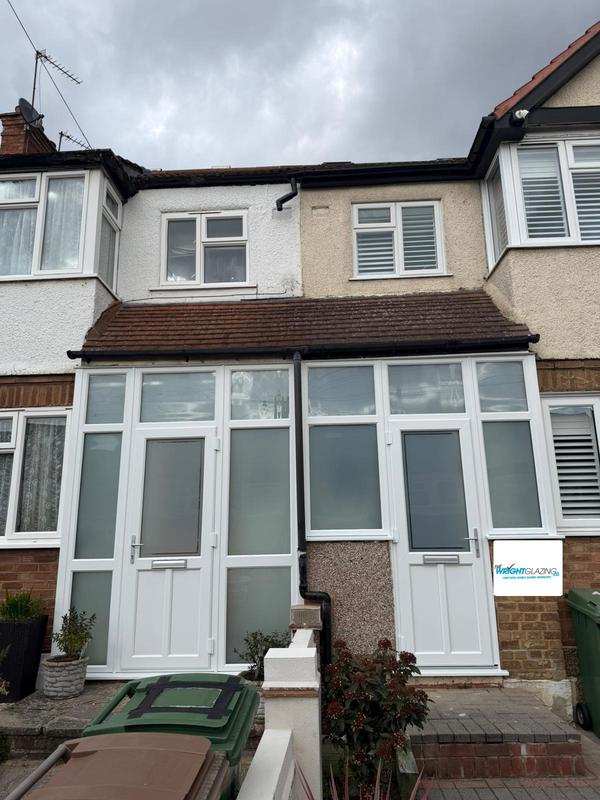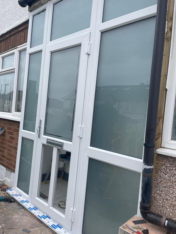 - Double PVC Porch Installation. Door are Rothwell (Glazed Top) with Victorian Etch glass and Satin glass on the Porch area.