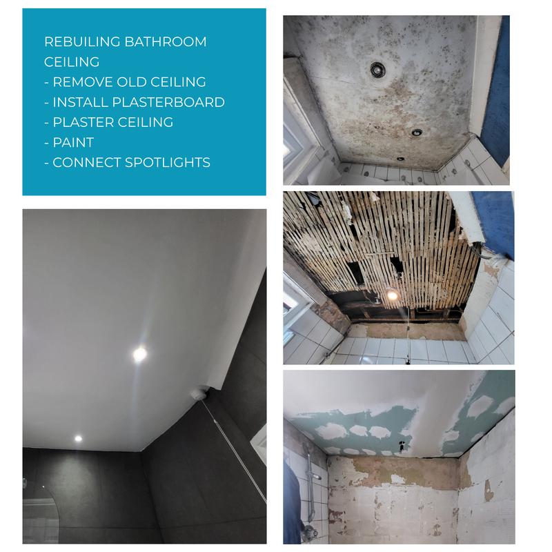 - Remove damaged ceiling caused by leak and fit a new ceiling.
