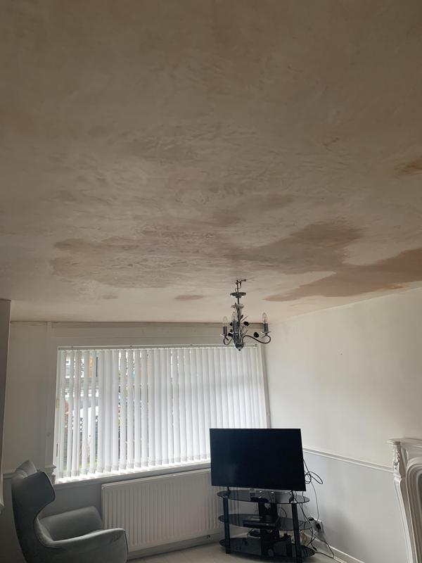 - leaking toilet repaired to ceiling new plasterboard and skim