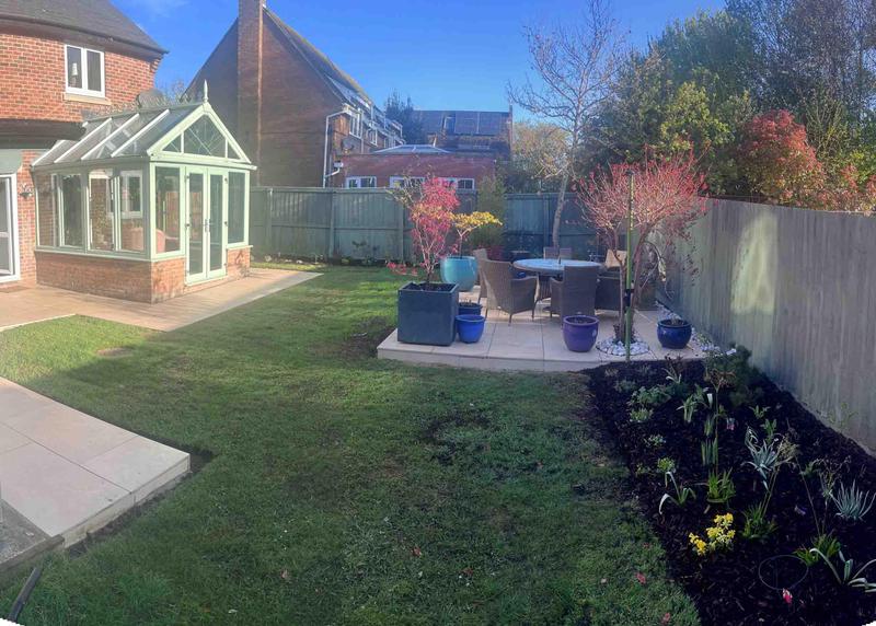 Richard - Image 1 "Kirk and Ron were just excellent. The quote was very competitive and the finished article is more than I expected. I am a landscape architect so have high standards and I knew what I wanted. The existing garden had old concrete riven slabs and overgrown boarders at the back and loose gravel at the front. The brief was to rip out all the old planting and replace with new topsoil and to replace all the paving with buff porcelain paving and a brick edge. The front created new porcelain paving to the front door area and two planted beds and grass. Kirk has transformed my garden from a run down space into a vibrant designer garden and added hugh value to the house. His skills at laying porcelain paving are exemplary. Not only was he quick but also very tidy and his workmanship was very professional. Look no where else if you want a really good garden transformation. I would highly recommend Kirk and his team."